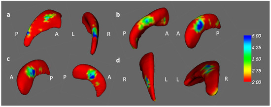 In the vertex-based shape analysis, a comparison of the healthy controls and prechemotherapy patients revealed differences in caudate and hippocampal shapes on the left side (Figure 8a,b). Additionally, paired t tests revealed a difference in the shape of the left hippocampus between the BB and BBF groups (Figure 8c). A difference in the shape of the right caudate was found between the BH and BHF groups (Figure 8d).