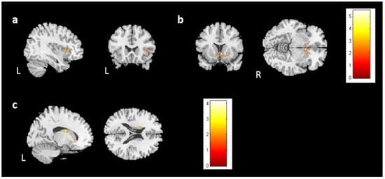 The results of the association between brain volume and the HADS-A/DSS. The results showed a negative association between the HADS-A and brain volume in the (a) right insula and (b) bilateral caudate. Moreover, a positive association was observed between the DSS and brain volume in the (c) left caudate. (corrected p value < 0.05, cluster size > 150, color bar: T scores).