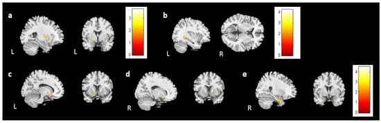For the evaluations of cognitive performance, a decrease in DSS scores was associated with reduced volume in the left caudate (Figure 9c). CTT1 and CTT2 did not show any significant association with brain volume changes. In subjective cognitive assessments, there was an association between decreased FACT-Cog and reduced volume in the left putamen (Figure 10a). Furthermore, the analysis identified a positive association between perceived cognitive impairment and volume changes in the left temporal gyrus (Figure 10b). Perceived cognitive abilities were also positively associated with volume changes in the bilateral putamen and left parahippocampus (Figure 10c–e). For Figure 9 and Figure 10, corrected p value < 0.05, cluster size > 150.