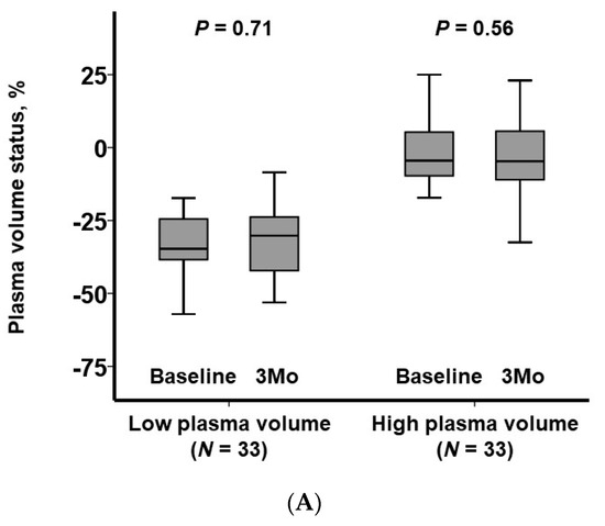 Trend of plasma BNP levels stratified by the plasma volume status (A) and a comparison of the change in plasma BNP levels between the high-plasma-volume group and the low-plasma-volume group (B). * p < 0.05 per Wilcoxon signed-rank test.