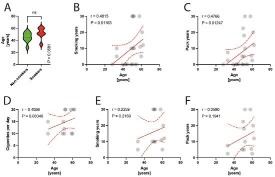 (A) Comparison of age in smokers/non-smokers group. (B–D) Correlation between the age and smoking years, pack-years index, and cigarettes per day in the total population. (E,F) Correlation between the age and smoking years, pack-years index in the smokers group. Circles represent values; red lines represent simple linear regressions, dotted lines represent 95% confidence intervals, ‘ns’ indicates lack of statistical significance.