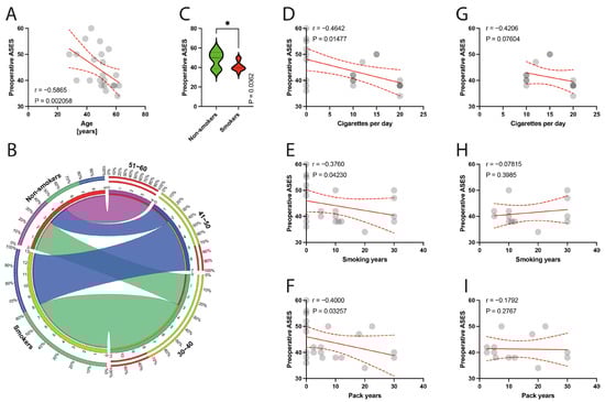 (A) Correlation between the preoperative ASES and the age of patients. (B) Comparison of smoking and age variable (30–60 years). (C) Comparison between smokers/non-smokers and preoperative ASES. (D–F) Correlation between the preoperative ASES and smoking years, pack-years index, and cigarettes per day in the total population. (G–I) Correlation between the preoperative ASES and smoking years, pack-years index, and cigarettes per day in the smokers population. Colors represent distinct groups of patients, while ribbons connecting various regions of the plot signify relationships between different data elements. Circles represent values; red lines represent simple linear regressions, dotted lines represent 95% confidence intervals, ‘*’ represents p < 0.05.