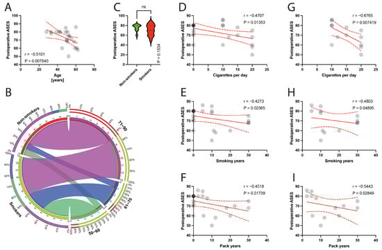 (A) Correlation between the postoperative ASES and the age of patients. (B) Comparison of smoking and age variable (50–90 years). (C) Comparison between smokers/non-smokers and postoperative ASES. (D–F) Correlation between the postoperative ASES and smoking years, pack-years index, and cigarettes per day in the total population. (G–I) Correlation between the postoperative ASES and smoking years, pack-years index, and cigarettes per day in the smokers population. Colors represent distinct groups of patients, while ribbons connecting various regions of the plot signify relationships between different data elements. Circles represent values; red lines represent simple linear regressions, dotted lines represent 95% confidence intervals. ‘ns’ indicates lack of statistical significance.