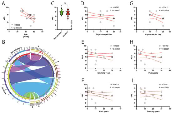 (A) Correlation between the VAS and the age of patients. (B) Comparison of smoking and VAS variable. (C) Comparison between smokers/non-smokers and VAS score. (D–F) Correlation between the VAS and smoking years, pack-years index, and cigarettes per day in the total population. (G–I) Correlation between the VAS and smoking years, pack-years index, and cigarettes per day in the smokers population. Colors represent distinct groups of patients, while ribbons connecting various regions of the plot signify relationships between different data elements. Circles represent values; red lines represent simple linear regressions, dotted lines represent 95% confidence intervals. ‘ns’ indicates lack of statistical significance.