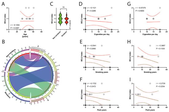 (A) Correlation between the BCL2 and the age of patients. (B) Comparison of smoking and BCL2 index. (C) Comparison between smokers/non-smokers and BCL2 index. (D–F) Correlation between the BCL2 and smoking years, pack-years index, and cigarettes per day in the total population. (G–I) Correlation between the BCL2 and smoking years, pack-years index, and cigarettes per day in the smokers population. Colors represent distinct groups of patients, while ribbons connecting various regions of the plot signify relationships between different data elements. Circles represent values; red lines represent simple linear regressions, dotted lines represent 95% confidence intervals. ‘ns’ indicates lack of statistical significance.