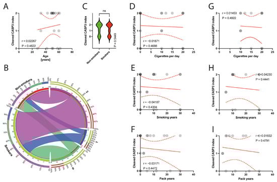 (A) Correlation between the cleaved caspase 3 and the age of patients. (B) Comparison of smoking and cleaved caspase 3 index. (C) Comparison between smokers/non-smokers and cleaved caspase 3 index. (D–F) Correlation between the cleaved caspase 3 and smoking years, pack-years index, and cigarettes per day in the total population. (G–I) Correlation between the cleaved caspase 3 and smoking years, pack-years index, and cigarettes per day in the smokers population. Colors represent distinct groups of patients, while ribbons connecting various regions of the plot signify relationships between different data elements. Circles represent values; red lines represent simple linear regressions, dotted lines represent 95% confidence intervals. ‘ns’ indicates lack of statistical significance.