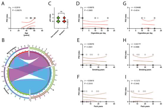 (A) Correlation between the p53 index and the age of patients. (B) Comparison of smoking and the p53 index. (C) Comparison between smokers/non-smokers and the p53 index. (D–F) Correlation between the p53 index and smoking years, pack-years index, and cigarettes per day in the total population. (G–I) Correlation between the p53 index and smoking years, pack-years index, and cigarettes per day in the smokers population. Colors represent distinct groups of patients, while ribbons connecting various regions of the plot signify relationships between different data elements. Circles represent values; red lines represent simple linear regressions, dotted lines represent 95% confidence intervals. ‘ns’ indicates lack of statistical significance.