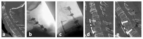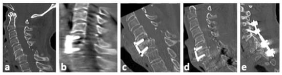 Representative CT images of patient no. 6 (Table 6). (a). Postinjury midline sagittal CT reconstruction. (b). Intraoperative 3D scan after anterior open reduction, discectomy, and fixation with intervertebral allogenous bone graft and plate C6/7. (c). Secondary dislocation of C6/7 nine days post operation. (d,e). Additional posterior reduction and stabilization of C4/5 to Th1/2 was performed.