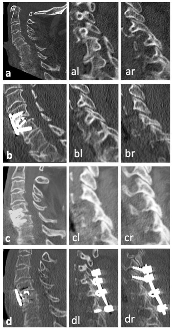 Representative CT images of patient no. 11 (Table 6). (a). Postinjury CT scan with midline sagittal reconstruction as well as perched left facet joint (al) and subluxation of right facet joint (ar) in parasagittal reconstructions. (b,bl,br). Corresponding CT reconstructions after anterior discectomy, intervertebral cage, and plate fixation C6/7 with adequate reduction in the anterior column and right facet joint (br) but persisting slight subluxation of the left facet joint (bl). (c,cl,cr). The patient presented with persisting neck pain five weeks post operation. CT reconstructions showed secondary dislocation with instability of the anterior column as well as increased subluxation of the left facet (cl). (d,dl,dr). Situation after posterior open reduction and additional posterior stabilization C4/5/6/7. While anatomical reposition of the anterior column was not achieved, stability was increased leading to pain relief and no further dislocation upon follow ups.