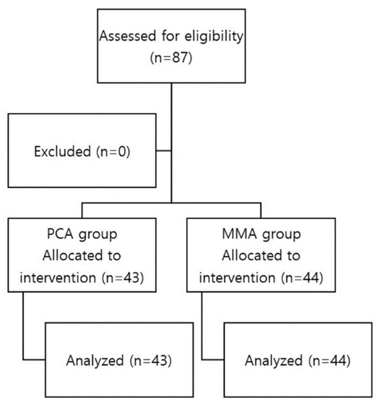 This study was conducted according to the guidelines of the Declaration of Helsinki and was registered with the Clinical Research Information Service (identifier: KCT0006638) after the protocol was approved by the Institutional Review Board of Inha University Hospital (Incheon, Republic of Korea, protocol code INHA-2021-02-005; date of approval 26 April 2021). Written informed consent was obtained from participants who were female patients aged ≥ 20 years, with the American Society of Anesthesiologists Classification of 1–3, scheduled for BABA robotic thyroidectomy for thyroid cancer. Patients were equally randomized to one of two groups: the PCA group with fentanyl or the opioid-free multimodal analgesia group (MMA Group) according to the list prepared through the Internet Randomization Site (https://www.sealedenvelope.com/simple-randomiser/v1/lists, accessed on 5 January 2021). Patients were excluded from the study if they had chronic pain syndrome, psychologic or neurologic dis-eases, arrhythmia, hepatic or renal diseases, or diseases of the respiratory system. Trial Registration Number: The Korean Clinical Research Information Service (CRIS) Registration Number: KCT0006638.