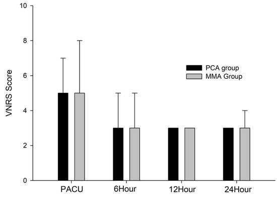 The median visual analogue scores in the post-anesthesia care unit and general ward in both groups. PCA, patient-controlled analgesia; MMA, multimodal analgesia; VNRS, visual numeric rating scale; PACU, post-anesthesia care unit.