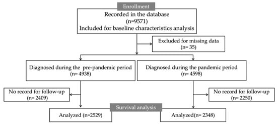 Figure 1 illustrates a flowchart depicting the cohort inclusion/exclusion criteria. Initially, a total of 9571 patients recorded in the database were enrolled, and 35 were excluded owing to missing data. In the pandemic and the pre-pandemic periods, 4598 and 4938 patients were diagnosed with GC, respectively. During the pre-pandemic period, follow-up records were missing for 2409 cases, leaving 2529 cases for survival analysis. During the pandemic period, follow-up records were missing for 2250 patients, resulting in 2348 patients for survival analysis.