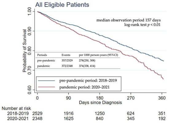 In this study, we defined the pandemic period as the exposure period and the pre-pandemic period as the control period. Japan declared its first state of emergency on 7 April 2020, and on 26 April 2020, the Ministry of Health, Labor, and Welfare requested a delay in cancer screening []. Although this request was retracted on 26 May 2020, the Japan Gastroenterological Endoscopy Society recommended the postponement of non-urgent gastrointestinal endoscopies []. Consequently, the number of upper gastrointestinal endoscopies performed to diagnose GC decreased by 9.4% to 38.6% between April 2020 and January 2021 []. Considering these factors, we defined the pandemic period as 2020–2021 and the pre-pandemic period as 2018–2019. Patients were assigned to either period according to the date of diagnosis.