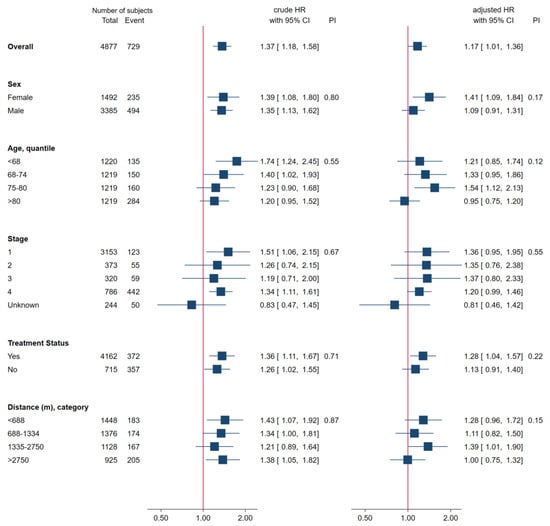 A subgroup analysis was conducted to explore the impact of the pandemic period on GC mortality risk (Figure 3). Subgroups were based on sex, age, clinical stage, treatment status, and travel distance. Age and travel distance were divided into quartiles. The vertical line represents a hazard ratio of one. The forest plots exhibit two different HR values: one crude on the left and the other adjusted on the right. The results consistently indicated an increase in mortality risk across all subgroups during the pandemic period. Furthermore, a likelihood ratio test revealed no significant interactions between the pandemic period and any subgroup category in the crude and adjusted models, suggesting that demographic and clinical factors did not substantially affect the impact of the pandemic period on GC mortality risk.