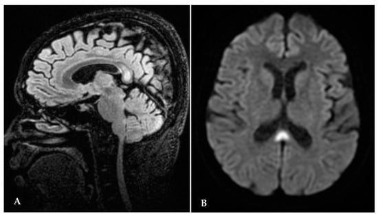 Following admission, the patient was referred first to a diabetologist, who diagnosed “overt diabetes”. This is not a coincidence since thiamine demand increases in metabolism of carbohydrates. Immediately after the diabetologic consultation, patient started insulin therapy and glucose monitoring, after which she underwent a full eye examination, which showed vertical downbeat nystagmus, papilledema, an oval retinal hemorrhage on inferotemporal vascular arcade; all such signs point to a pattern of central nervous system involvement. After the ophthalmological examination, the patient underwent a brain MRI, which showed an abnormal signal in the splenium of corpus callosum and a symmetrical hyperintensity in thalamic and periaqueductal areas (Figure 1A,B), all findings indicative of WE. The patient then underwent a neurological examination, which showed ataxia with impaired walking and nystagmus in all directions of gaze.