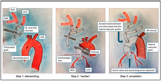 - Kim, M.; Matalanis, G. Illustrated Technique of “Branch-First” Total Aortic Arch Replacement. Oper. Tech. Thorac. Cardiovasc. Surg. 2022, 27, 23–38. [Google Scholar] [CrossRef]