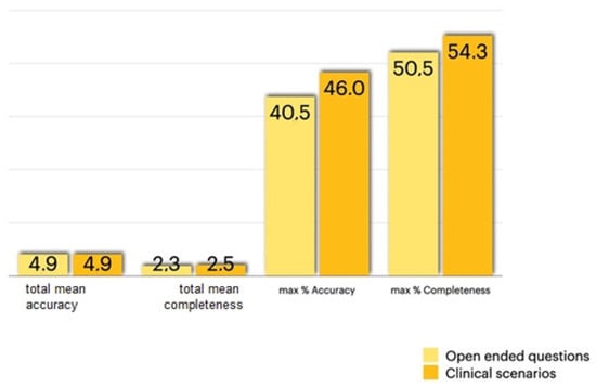 Total mean accuracy, total mean completeness, maximum accuracy, and maximum completeness of the open-ended questions and clinical scenarios.