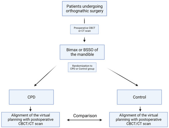 Flowchart of the study protocol. Patients undergoing orthognathic surgery in the form of a BSSO of the mandible were included and randomized either to the CPD or to the control group. Postoperative CBCT scan and the virtually planned position were aligned and differences measured. Abbreviations: BSSO: bilateral sagittal split osteotomy, CPD: condylar positioning device, CBCT: cone-beam computed tomography, CT: computed tomography.