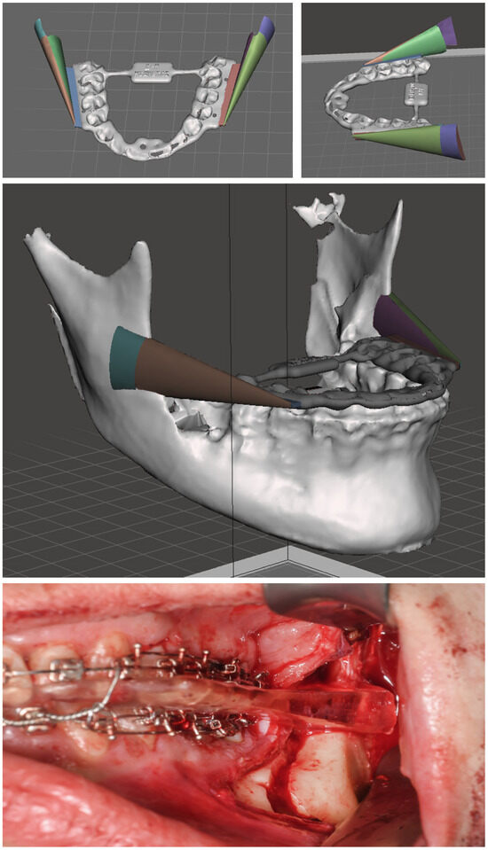 The patient-specific CPD was designed with the open-source software Meshmixer (Autodesk, San Francisco, CA, USA). The operation was planned virtually with IPS CaseDesigner (KLS Martin Group, Tuttlingen, Germany), in which the STL files of the operated jaw were generated and subsequently exported. The final splint and the operated mandible were imported to Meshmixer (Autodesk, San Francisco, CA, USA). With preformed tools, an additional wing was attached to each side of the final splint. The surface of the ascending ramus was imprinted using a Boolean function. The modified splint thus reflected the planned position of the ramus (Figure 2).