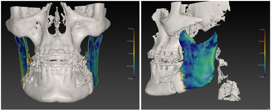 Via IPS CaseDesigner (KLS Martin Group, Tuttlingen, Germany), the position of the left and right ramus planned virtually was compared with the postoperative outcome. A heat map was generated (Figure 3) depicting differences between the planned position and postoperative results in millimetres and degrees.