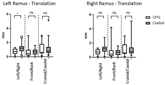 The deviation of the ascending ramus is given in millimetres. The CPD appears to be slightly more precise; however, differences were only significant for the left/right translation of the left ramus (p = 0.04 with Mann–Whitney test). * = significant result, ns = non-significant result.