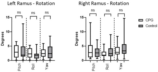 The rotation of the ramus is measured in degrees and depicted for the left and right ramus separately. Values in the CPD and control group were comparable without any significant difference between both groups. ns = non-significant result.