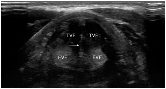 Transverse view of normal vocal folds during valsalva (adduction). FVF, false vocal fold; TVF, true vocal fold. White arrow indicates hyperechoic medial margins of true vocal folds meeting in midline. Reproduced with permission of Dr. Noel from [].