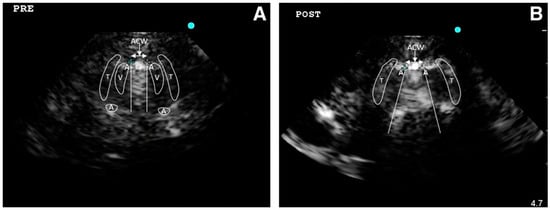 The imaging from laryngeal ultrasound demonstrates the air column width before (A) and after (B) endotracheal tube cuff deflation. After cuff deflation, the fan-shaped widening air column width obliterates surrounding structures such as vocal cords and arytenoid cartilage by acoustic shadow (T, thyroid cartilage; V, vocal cord; A, arytenoid cartilage). Reproduced with permission of Dr. Sutherasan from [].