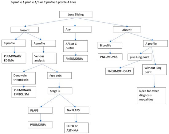 The BLUE protocol (Figure 4) is a flow chart to approach acute respiratory failure and its differential diagnosis by lung US (LUS) in a standardized way proposed by Lichtenstein and updated in 2008 [].