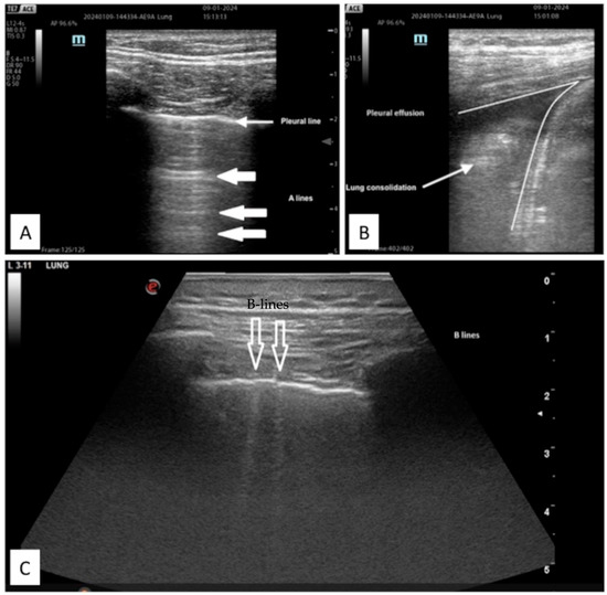 Example of LUS images of (A) normal aerated lung with pleural and A-line; (B) pleural effusion and associated parenchymal consolidation; (C) B-lines sign of interstitial syndrome.