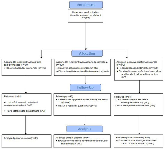 All data were analyzed according to a pre-established statistical plan in an intention-to-treat fashion. Women who received transfusion due to severe symptoms of anemia after study inclusion and women lost to follow-up six weeks postpartum were not included in the final analysis. Comparisons of continuous variables were performed using a Kruskal–Wallis test and Tamhane’s T2 test for post hoc analysis. Categorical variables were compared using the Chi-square test. A p < 0.05 was considered statistically significant. SPSS software (version 24.0; IBM Corporation, Armonk, NY, USA) was used for statistical analysis.