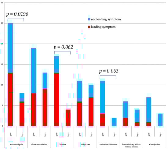 Statistical analysis of the symptomatic patients, depending on gender and a specific symptom, showed that the sum of symptoms (leading and non-leading), such as abdominal pain, was significantly higher in girls (Figure 2). Moreover, in girls, the sum of symptoms (leading and non-leading), such as abdominal distension and diarrhea, had a tendency to predominate, but this value was not statistically significant.