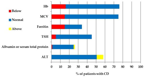 Our study showed that 24% of patients did not have any additional tests performed at the time of diagnosis of CD, which is inconsistent with the ESPGHAN recommendations [25]. This is very disturbing because 22.37% of the tested patients showed iron deficiency with or without anemia. Maintaining this percentage proportion, hypothetically in the group of untested patients (n = 24), five of them could have anemia. The appropriate supplementation was not implemented in these patients, which may hinder their recovery process on a GFD.