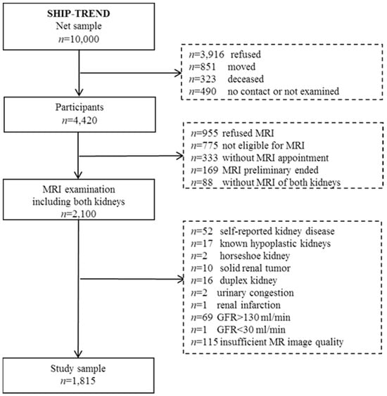 In the presented cross-sectional study, we included these 2100 subjects who underwent whole-body MRI including both kidneys. We excluded participants with self-reported kidney disease (n = 52), known hypoplastic kidneys (n = 17), horseshoe kidney (n = 2), solid renal tumour (n = 10), duplex kidney (n = 16), urinary congestion (n = 2), renal infarction (n = 1), nephrectomy (n = 0), kidney stones (n = 0), and GFR > 130 mL/min (n = 69), as well as GFR < 30 mL/min (n = 1). Furthermore, participants with insufficient MR image quality were excluded (n = 115). The final analytical sample comprised 1815 participants (930 women) aged 21–81 years.
