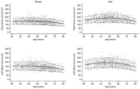 In women, renal volume was nearly constant until the age of 59 years and decreased in the age group of 60–81 years. As shown in the continuous graph in Figure 2, volume loss began after the age of 50 years. This corresponds with the findings of other groups, describing a similar trend of decreasing total renal volume (TRV) [9,27] or cortical volume [5,16] in both older men and women. Additionally, our data show that RV in women is constant until the age of 50 years. In men, we found the highest RV in the middle-aged group (40–59 years) and lower volumes in the younger (22–39 years) and in the oldest age group (60–81 years). This was also reported by Roseman et al., 2017 [10]. This could be interpreted alongside the glomerular hyperfiltration/hypertrophy theory: in a high risk population, patients in the third tertile of kidney length (11.7–16.1 cm) were at higher risk of cardiovascular mortality and cardiovascular events, while patients in the first tertile of kidney length (7.8–10.8 cm) were not [24].