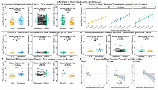 Behavioural Differences in Mean Reaction Time (s) during a Tower of London task for Healthy Controls (HCs), Patients with chronic TBI on placebo (TBI-placebo), and Patients with chronic TBI on Methylphenidate (TBI-MPh). (A) Statistical Differences in Mean Reaction Time between groups for all task loads: Wilcoxon Rank Sum Tests indicate that TBI-placebo and TBI-MPh have a slower reaction time than HCs across all task loads. (B) Trends in Mean Reaction Time in HCs, TBI-placebo, and TBI-MPh across all task loads. TBI-MPh ameliorates deficits in reaction time at 1 move. (C) Statistical Differences in Mean Reaction Time between groups for Count. Wilcoxon Rank Sum Tests indicate that TBI-placebo and TBI-MPh have a slower reaction time than HCs for Count. (D) Statistical Differences in Mean Reaction Time between groups for 1 move. Wilcoxon Rank Sum Tests indicate that TBI-placebo have a slower reaction time than HCs for 1 move. (E) Statistical Differences in Mean Reaction Time between groups for 3 moves. Wilcoxon Rank Sum Tests indicate that TBI-placebo and TBI-MPh have a slower reaction time than HCs for 3 moves. (F) Spearman’s correlations between change in Mean Reaction Time (TBI-MPh—TBI-placebo) versus baseline Mean Reaction Time (TBI-placebo). Spearman’s rho (ρ) indicates Methylphenidate ameliorates deficits in Mean Reaction Time at 1 move. Dashed line indicates zero, and dotted line indicates a ceiling effect. ns: p > 0.05; *: p < 0.05; **: p < 0.01; ***: p < 0.001.