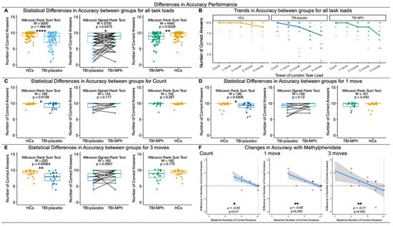 Behavioural Differences in Accuracy during a Tower of London task for Healthy Controls (HCs), Patients with chronic TBI on placebo (TBI-placebo), and Patients with chronic TBI on Methylphenidate (TBI-MPh). (A) Statistical Differences in Accuracy between groups for all task loads: Wilcoxon Rank Sum Tests indicate that TBI-placebo and TBI-MPh are less accurate than HCs across all task loads and TBI-MPh are more accurate than TBI-placebo across all task loads. (B) Trends in Accuracy in HCs, TBI-placebo, and TBI-MPh across all task loads. TBI-MPh ameliorates deficits in accuracy at 1 move and 3 moves. (C) Statistical Differences in Accuracy between groups for Count. Wilcoxon Rank Sum Tests indicate that TBI-placebo have a lower accuracy than HCs for Count. (D) Statistical Differences in Accuracy between groups for 1 move. Wilcoxon Rank Sum Tests indicate that TBI-placebo have a lower accuracy than HCs for 1 move. (E) Statistical Differences in Accuracy between groups for 3 moves. Wilcoxon Rank Sum Tests indicate that TBI-placebo have a lower accuracy than HCs for 3 moves. (F) Spearman’s correlations between change in accuracy (TBI-MPh—TBI-placebo) versus baseline accuracy (TBI-placebo). Spearman’s rho (ρ) indicates Methylphenidate ameliorates deficits in Accuracy at Count, 1 move, and 3 moves. Dashed line indicates zero, and dotted line indicates a ceiling effect. ns: p > 0.05; *: p < 0.05; **: p < 0.01; ****: p < 0.0001.