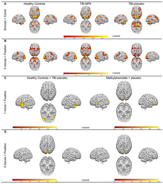 Differences in activity for the 3 moves versus Count, the 1 move versus fixation, and the 3 moves versus fixation contrasts. (A) Significant activation peaks for the 3 moves versus Count contrast for each experimental group. (B) Significant activation peaks for the 3 moves versus fixation contrast for each experimental group. (C) Statistically significant activation peaks for the 1 move versus fixation contrast for HCs and TBI-MPh versus TBI-placebo. (D) Statistically significant activation peaks for the 3 moves versus fixation contrast for HCs and TBI-MPh versus TBI-placebo. No significant differences between HCs and TBI-MPh. Results are superimposed on a template supplied by Surf Ice (https://www.nitrc.org/projects/surfice/).
