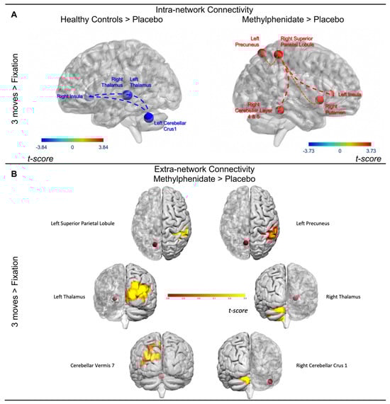 Chronic TBI patients have persistent compromised structural and functional connectivity due to grey and white matter damage [112,113,114,115,116,117,118]. This was investigated initially within a network formed by a set determined to be active during the execution of the task, specifically the 3 moves > fixation contrast. TBI-placebo displayed heightened connectivity between the right insula, bilateral thalamus, and left cerebellum versus HCs (Figure 4A). TBI-MPh displayed enhanced positive connectivity above and beyond placebo in the network important for visuospatial planning between the right superior parietal lobule and primarily the left insula and left cerebellum as well as the left precuneus, and right putamen (Figure 4A). HCs and TBI-MPh did not display differences in connectivity between the regions composing this network. This suggests MPh normalised connectivity differences between TBI-placebo and HCs within this network.