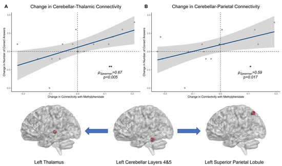 Informed by the within-network and beyond-network connectivity and motivated by our group’s previous work, we investigated whether changes in connectivity between TBI-MPh and TBI-placebo related to changes in accuracy between MPh and placebo at the 3 moves cognitive load. We demonstrated that individual connectivity changes with MPh administration between the cerebellum and the thalamus (Figure 5A) (loge(S) = 5.43, p = 0.005, ρSpearman = 0.67, CI95%[0.24, 0.88], npairs = 16) and the parietal lobule (Figure 5B) (loge(S) = 5.64, p = 0.017, ρSpearman = 0.59, CI95%[0.11, 0.84], npairs = 16) positively correlate with changes in accuracy with MPh. This highlights an important relationship between changes in thalamic-cerebellar and parietal-cerebellar connectivity and improved performance of MPh in ameliorating neurocognitive deficits in patients with chronic TBI [120,121,122,123,124].