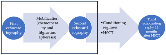 During the study period, echocardiography was performed at three time points: first, on evaluation and decision to enroll the patient in the transplantation process (before the mobilization procedure); second, before the transplantation (the conditioning regimen) procedure; and third, at follow-up—12 months after HSCT. In this part of the study, we aimed to evaluate only the impact of mobilization procedure on the heart, so only the measurements of the first two echocardiography examinations were taken into account. The echocardiographic workflow is presented in Figure 1. The data of 47 patients were analyzed. Echocardiography was performed and evaluated by one experienced cardiologist using a Phillips Epiq 7 ultrasound machine. The typical timeframe between the two echocardiography scans was a median (min–max) of 49 (20–168) days. The left ventricular end diastolic diameter (LVEDD) from the parasternal long axis view was measured, and the LVEDD index according to body surface area (BSA) (LVEDDi) was calculated. Left ventricular ejection fraction (LV EF) was calculated from the apical two- and four-chamber views based on left ventricular (LV) volumes, using the modified biplane Simpson method. Volumetric measurements were derived from tracings of the border between the myocardium and LV cavity in the end-systole and end-diastole in the apical two- and four- chamber views. Global LV systolic function was assessed by calculating the difference between the end-diastolic and end-systolic value, divided by the end-diastolic value. Left ventricular global longitudinal strain (GLS) was calculated automatically using a postprocessing system. The endocardial borders were traced in the end-systolic frame of the 2D images from the 3 apical views (two-, three-, and four-chamber). Speckles were tracked frame by frame throughout the LV wall during the cardiac cycle. Segments that failed to track were manually adjusted by the operator. Diastolic LV dysfunction was evaluated using early mitral inflow velocity/mitral annular early diastolic velocity (E/E’) in the apical four-chamber view using pulse and tissue doppler. Right ventricle (RV) end diastolic diameter (RVEDD) was measured at the base from the apical four-chamber view, and tricuspid annular systolic velocity (S’) was also evaluated from the apical four-chamber view using tissue doppler. The measurements were collected before and after the mobilization process (before the conditioning regimen) and compared.