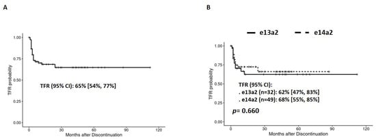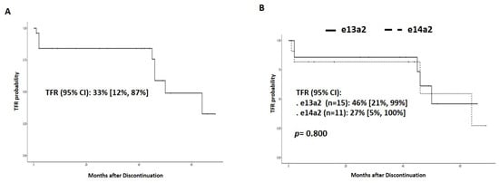 Data of TKI discontinuation were available in 26 2G-TKI-treated patients (15 (58%) with the e13a2 transcript and 11 (42%) with e14a2). The probability of TFR at 64 months (95% CI) of the whole 2G-TKI cohort was 33% [95% CI: 12%, 87%]. No significant differences in TFR were observed according to the expression of the e13a2 and e14a2 transcripts (46% [21%, 99%] vs. 27% [5%, 100%], p = 0.800) (Figure 5A,B) (OR [95% CI: 0.5, 12.5], p = 0.299).