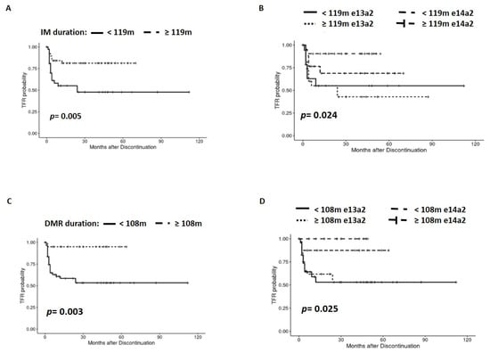 The duration of IM treatment and sDMR before discontinuation significantly correlated with TFR in our cohort (hazard ratio (HR) [95% CI]: 0.3 [0.13, 0.73], p = 0.008 and HR [95% CI]: 0.987 [0.98, 1.00], p = 0.046, respectively). Accordingly, we analyzed the cut-off point of the duration of IM treatment and of sDMR that might best discriminate TFR, and we observed that patients treated at least 119 months with IM relapsed less post-discontinuation than those that discontinued IM before completing 119 months (p = 0.005) (Figure 2A). In addition, cases with the e14a2 transcript type treated at least 119 months with IM presented a better TFR (p = 0.024) (Figure 2B). Similarly, we established a minimum of 108 months of sDMR that also favored TFR (p = 0.003) (Figure 2C). This statistical difference was maintained when we separated patients according to the transcript type (p = 0.025), being better in patients with the e14a2 transcript type and more than 108 months of sDMR (Figure 2D).