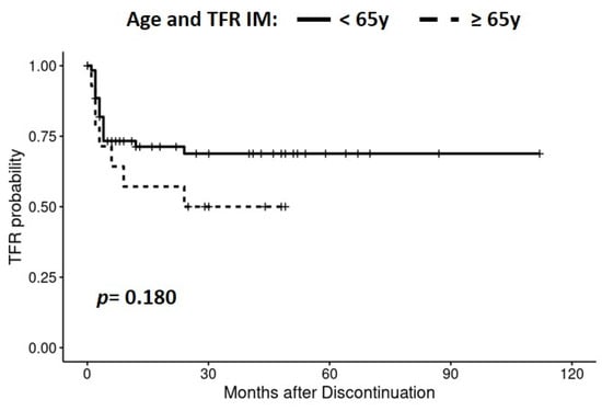 Additionally, we analyzed the influence of age and the Sokal or ELTS scores at diagnosis on TFR in patients that discontinued IM. We did not observe any association between age with a cut-off of 65 years (Figure 3). Similarly, the effect of age on TFR according to the transcript type in IM-treated patients was not relevant. A lack of significance was also observed when analyzing the influence of age on DMR and the Sokal or ELTS score at diagnosis on DMR and TFR, in both the whole series and regarding the two transcript type groups.