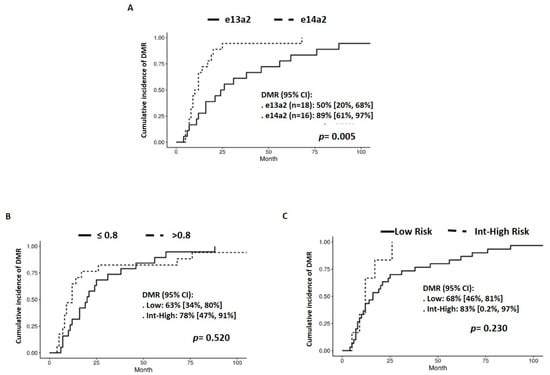 Cumulative incidence of DMR at 2 years in 2G-TKI-treated patients by transcript type (A) and considering Sokal and ELTS scores (B,C) at 2 years, respectively.