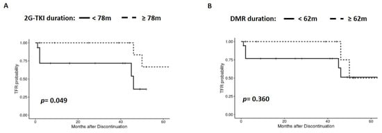 We observed that patients with at least 78 months of 2G-TKI treatment had a better TFR than those with less than 78 months of treatment (p = 0.049) (Figure 6A). Moreover, 62 months of sDMR was the most representative duration affecting TFR (p = 0.360) (Figure 6B). The sample size did not allow analysis of these outcomes according to the transcript type.