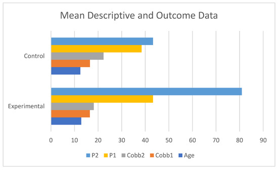 The mean age of the treatment group was 12.83 years, with a range of 10–15 years. The control group had a mean age of 12.42 years, and a range of 10–15 years. The average baseline Cobb angles for the experimental group and control group were 16.5 and 16.5 degrees, respectively, with 4.03 and 4.45 degrees of standard deviation for the treatment and control groups, respectively. The average baseline height was 154.71 cm for the treatment group and 148.46 cm for the control group. At 1 year, these values increased to 156.43 cm and 149.54 cm, respectively. Figure 1 shows a comparison of demographic and outcome data for age, initial and final Cobb angles, and initial and final serum progesterone levels between the groups.