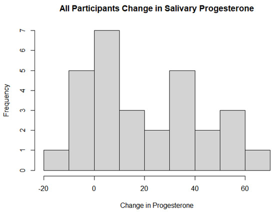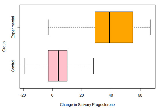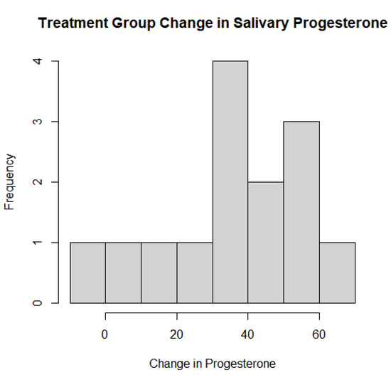 The baseline and 1-year salivary progesterone levels in the treatment group were averages of 43.3 pg/mL and 80.9 pg/mL, respectively. The averages for the control group were 38.5 pg/mL and 43.3 pg/mL. For the Welch’s t-test analyzing whether there was a statistically significant effect on salivary progesterone levels depending on the usage of pregnenolone therapy, there was extremely strong evidence that the pregnenolone therapy influenced the salivary hormone levels with a p-value of 0.00004739. The 95% confidence interval was between −46.19 and −19.40 to indicate that the mean between the groups was not equal to 0. The one-sample t-test of the treatment group based on dosage and its effects on salivary progesterone levels also showed extremely strong evidence that the pregnenolone therapy increased the salivary progesterone levels with a p-value of 0.0000121 and a 95% confidence interval between 25.73 and 49.55. As the mean change was much higher than 0 for this confidence interval while the other 95% confidence interval testing the means between the experimental and treatment groups was less than 0, this indicates that pregnenolone therapy did have a substantial impact on improving the salivary progesterone levels more so than not taking any pregnenolone at all. The histograms of the entire group of participants as well as the treatment group only with their respective changes in salivary progesterone levels are shown in Figure 2 and Figure 3 below. Figure 4 details the mean and quartile ranges of the change in progesterone between the experimental and control group (note that the colors in Figure 4 bear no significant meaning).