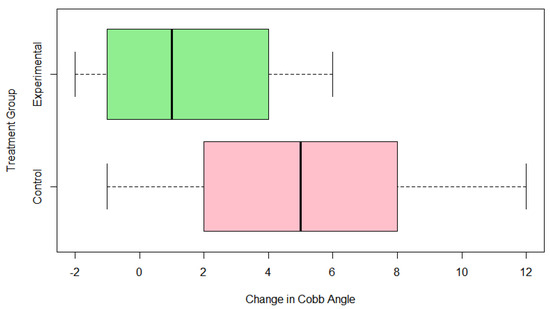 Upon investigating whether the pregnenolone changed the development of the Cobb angle, one-sample t-tests for each group separately showed that the Cobb angle changes were of low statistical significance in the treatment group (p = 0.05185), but very statistically significant in the control group (p = 0.0001949). The t-test was set with mu = 0, the average change in the treatment group was 1.64 degrees, and the average change in the control group was 5.77 degrees. In looking at the p-values and the average changes, the treatment group showed a change that was not statistically significant from zero. In this instance, being closer to zero indicates a smaller curve progression (a more positive number from zero indicates that the curve has progressed). The control group showed an average change in Cobb angle of 5.77 degrees with a p-value of 0.0001949. This leads to the result that the control group had statistically significant evidence that the curves did progress beyond 0 to become worse without the pregnenolone therapy. The pregnenolone therapy resulted in a smaller curve progression compared to those not treated with the pregnenolone therapy. From the Welch’s t-test conducted in R-Studio to analyze the relationship between a difference in curve progression between the treatment and control groups, it was found that there was a statistically significant difference in curve angle progression based off the treatment of pregnenolone given to the two groups. When conducting a Welch’s t-test across the groups, a p-value of 0.005378 was given for a 95% confidence interval of (1.355765–6.896982). Since the p-value of 0.005378 shows statistically significant results, the experimental group receiving the pregnenolone experienced a smaller progression of their Cobb angle following treatment. There is strong evidence to suggest that the experimental group exhibited a smaller progression in their Cobb angle from the treatment. As zero is not included in the 95% confidence interval, this strengthens the argument that the treatment caused a decreased curve progression compared to the control group. From the Excel and R Studio analyses, the following information was produced. The experimental group’s mean difference in Cobb angle was 1.642 degrees. The control group’s mean difference in Cobb angle was 5.769 degrees. The standard deviation in Cobb angle difference for the experimental group was 2.767 degrees. The standard deviation in Cobb angle difference for the control group was 3.786 degrees. The Welch’s t-test t-value was 3.0899, which was positive because there was a smaller mean for the experimental group to indicate a smaller Cobb angle progression. Figure 7 highlights a boxplot of the mean outcomes of Cobb angle change between the two groups, with the experimental group having the lower average Cobb angle change and quartile range (note that colors bear not significant meaning).