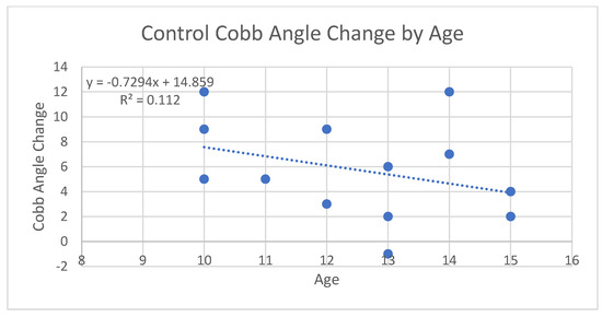 The study involves a relatively small sample size, with only twenty-seven participants in total. If more data points or a stronger relationship could have been found, a more confident R-squared value could have potentially been calculated. From the results of this study, there is little evidence to support that there truly is a relationship between the age of onset and the curve progression. In Figure 8 of the treatment group’s graph, there are six points above the trendline, seven points below the trendline (two are at age 12 at −1), and one point on the trendline. In Figure 9 of the control group’s graph, there are six points below the trendline, one point on the trendline, and six points above the trendline with a high standard deviation. Similar results are present in the combined group’s trendline in Figure 10. There is a high standard error from the trendline, and a small R-squared equal to 0.0727. It is worth noting that the overall combined group experienced a negative slope at −0.6016. The graphs do not provide a strong relationship between the age of onset and the change in Cobb angle.